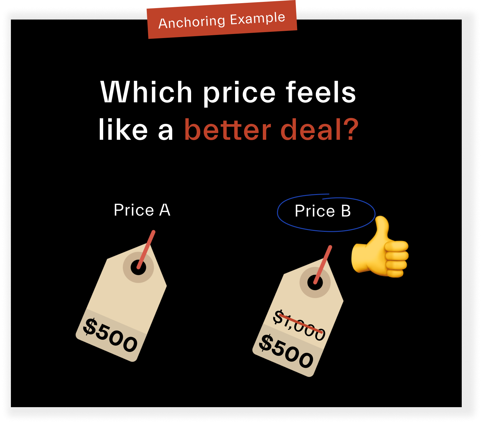 Anchoring is a psychological bias where we rely too much on the first piece of information we’re given (the “anchor”) when making decisions. Once this anchor is set in our minds, we form other judgments around it. As a result, there’s a tendency to interpret new information relative to the anchor in our minds.