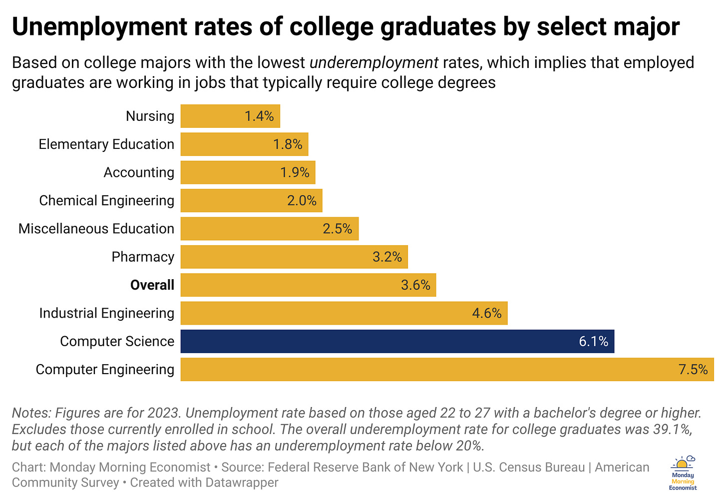Fresh computer science graduates are facing unemployment rates of 6.1% to 7.5%, more than double what biology and art history majors are experiencing [Yahoo! Finance]
