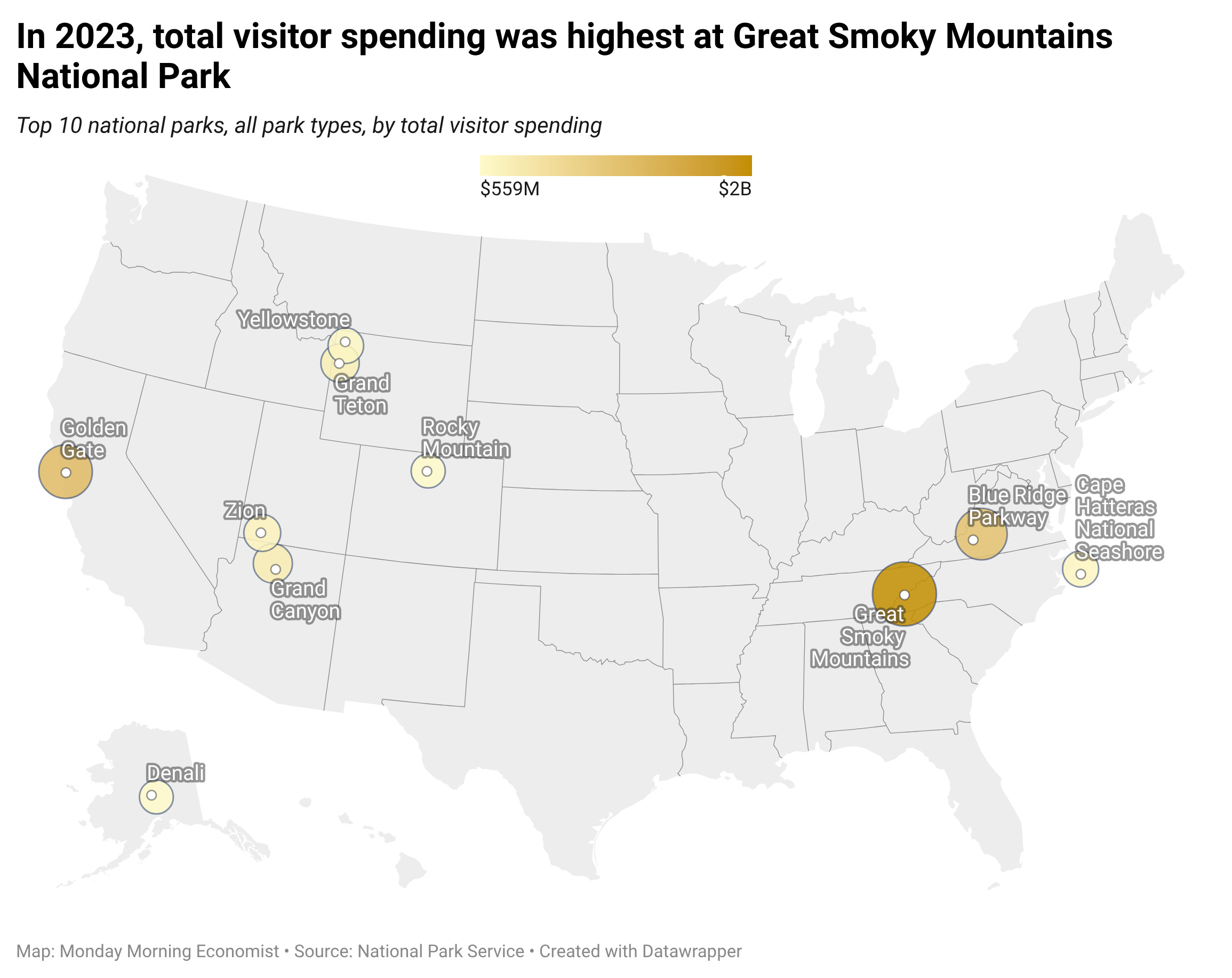 In 2023, there were 415,400 jobs in local economies tied to supporting National Park visitors, generating $19.4 billion in wages and salaries [USA Facts]
