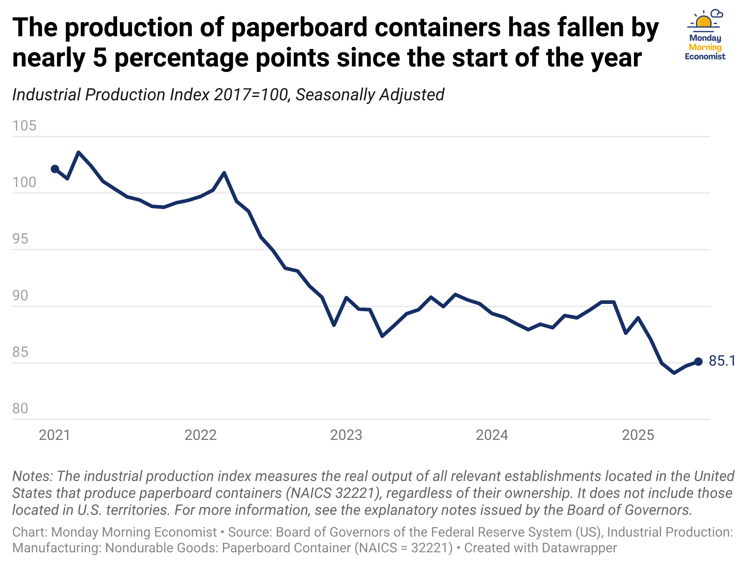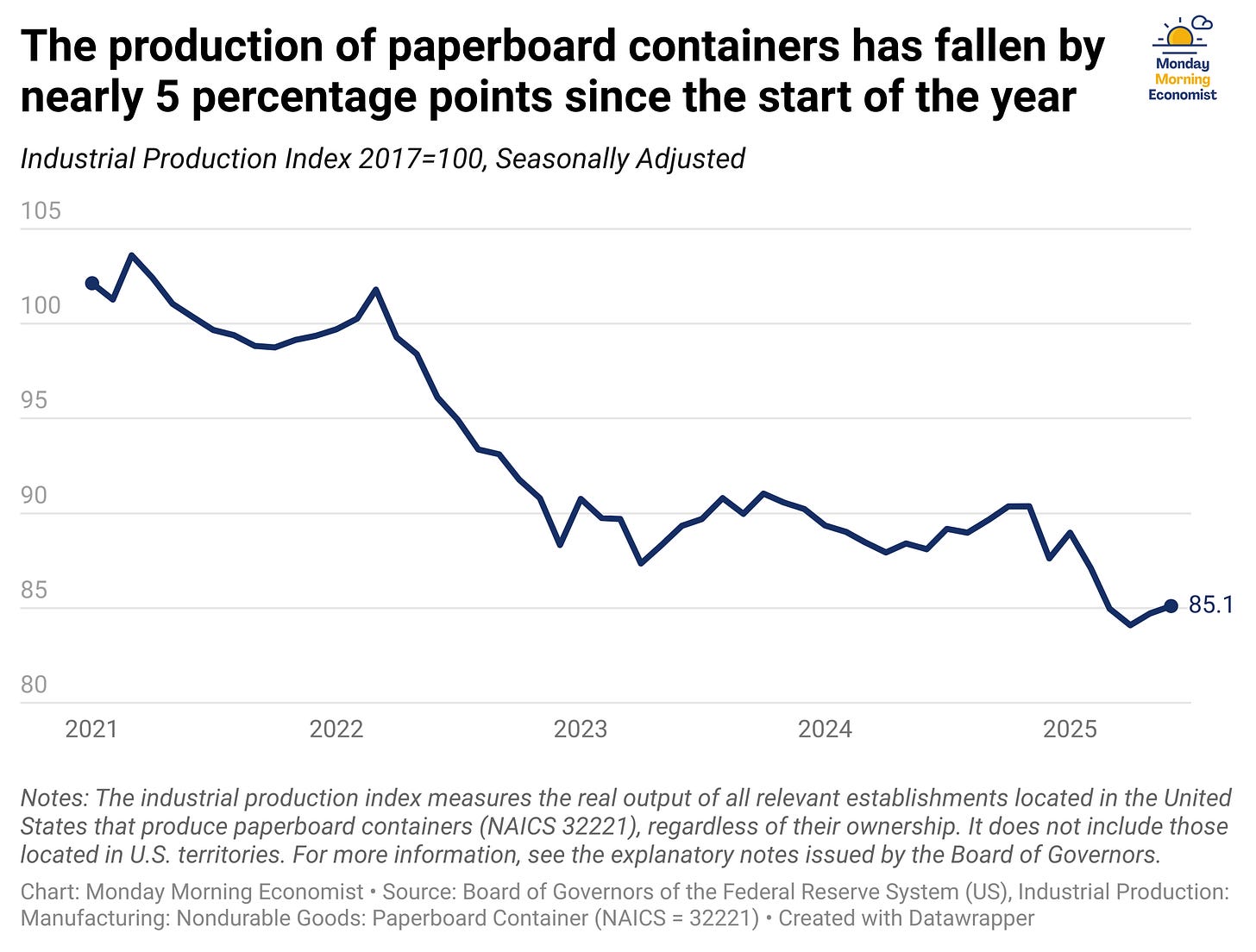 This relationship is why corrugated box shipments have earned the nickname “the cardboard box index.” Former Fed Chair Alan Greenspan, who served from 1987 to 2006, was known to track it as a real-time signal of economic activity. But what would he see if he were looking at the news today?