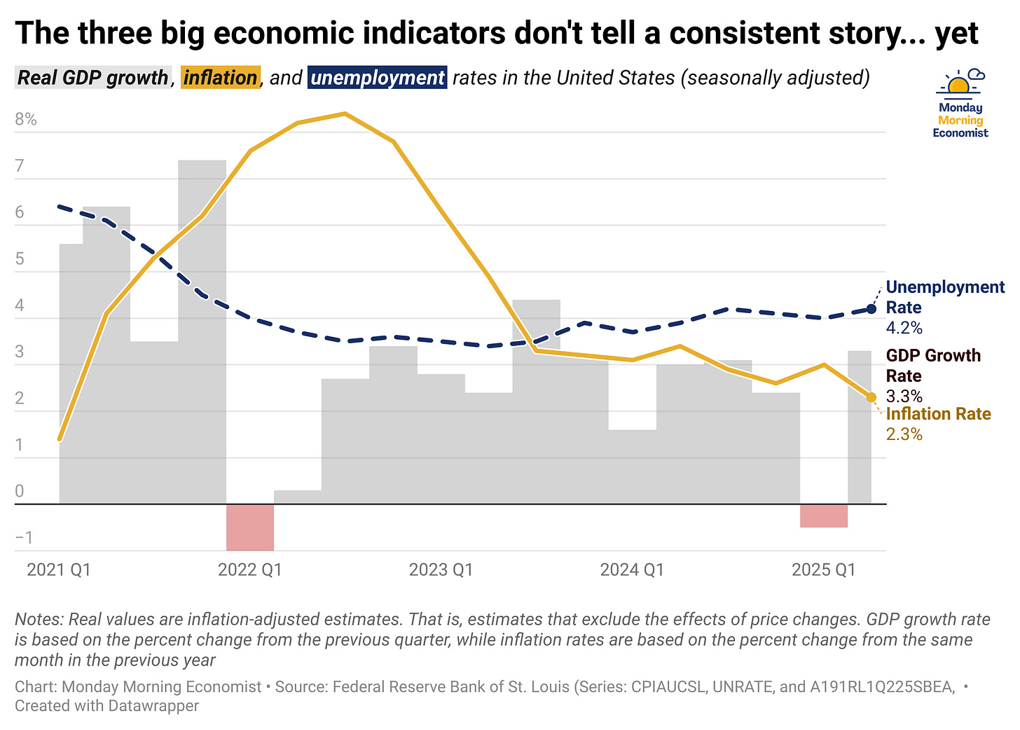 There are lots of ways to measure the economy’s progress. Builders breaking ground on new homes can signal confidence that buyers are ready. Fewer car sales might suggest families are holding back on big purchases. Economists track dozens of these measures, but three of them (gross domestic product, inflation, and unemployment) tend to dominate the headlines each month.