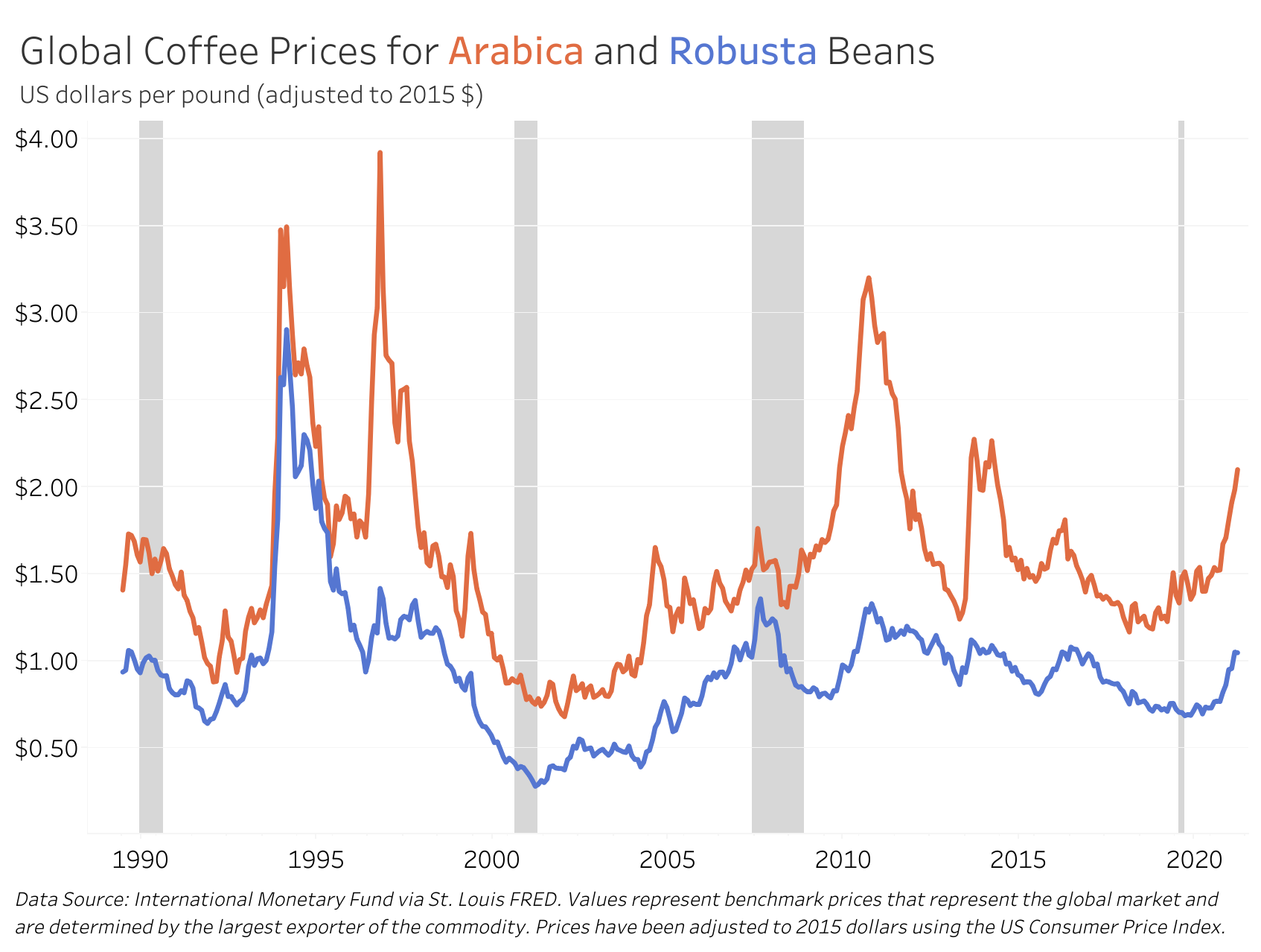 Below are global coffee benchmark prices reported by the International Monetary Fund dating back to 1990. These prices are determined by the largest exporter and are intended to be indicative of the global price of the commodity being reported. The data from the IMF was reported in nominal terms (prices for that particular month in time), but I’ve adjusted them to real terms to account for inflation by using the U.S.’s consumer price index for the associated month in time. The values below for arabica and robusta beans have been adjusted to the 2015 prices in US dollars.