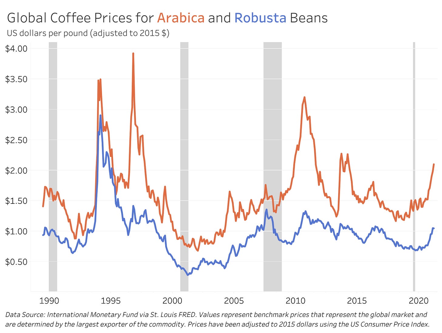 The November 2021 benchmark price for a pound of arabica beans was $2.63 and $1.27 for a pound of robusta beans [International Monetary Fund]
