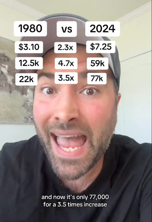In 1980, the median family income was $21,020, but Smith rounds this up to $22,000 to make his argument look better. We don’t have data on 2024 income yet since the year isn’t over. He doesn’t cite his 2024 source, but I’m guessing he used the first result he found on a Google search which comes from a financial investment blog making some dubious assumptions on income. The most reliable data we have on income come from the 2022 Census, which reports a median family income of $92,750. Instead of income growing by 3.5 times as Smith claims, median family incomes have actually increased 4.4 times!