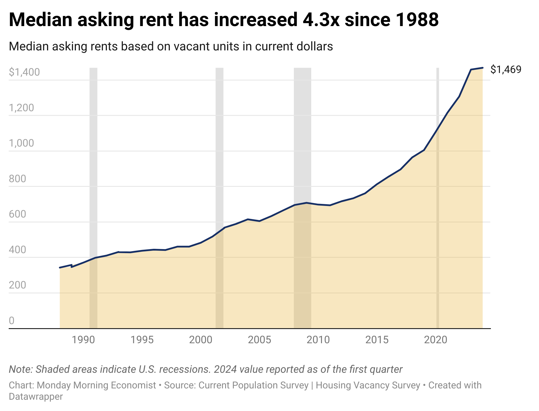 The latest available data from the Census shows the median asking rent for vacant rental units $1,469 for the first quarter of 2024, not $1,900 as Smith claims. If we wanted to stay consistent with our family income levels from before, the Census found the median rent in 2022 was $1,300. Again, while there has been a significant increase in rental prices in the past 40 years, the actual jump (6.0 times) is not as dramatic as Smith portrays (7.8 times). It’s hard to understate the impact of the housing crisis, but several factors, including urbanization, supply constraints, and improved housing quality, contribute to higher rents.