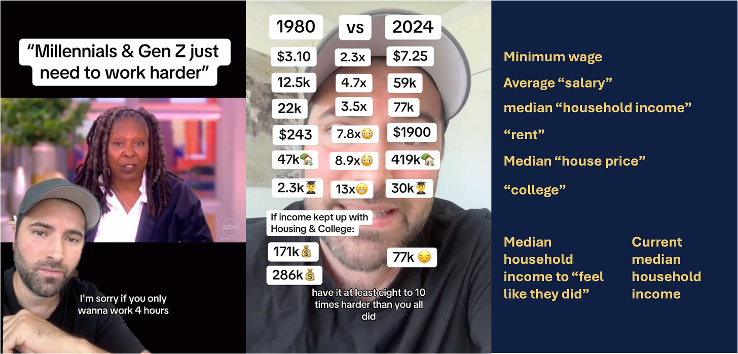Freddie Smith relies on sensationalism and selective data to paint a dire picture of today’s economic reality. A lot of the things we buy have become more affordable. There are challenges facing every generation, but the situation is far more nuanced. Income levels have risen a lot since the 1980s, but so has wealth and income inequality. It’s important to have a more balanced perspective that acknowledges both the progress and the ongoing challenges. Unfortunately, accurate data and relevant context isn’t as popular on social media.