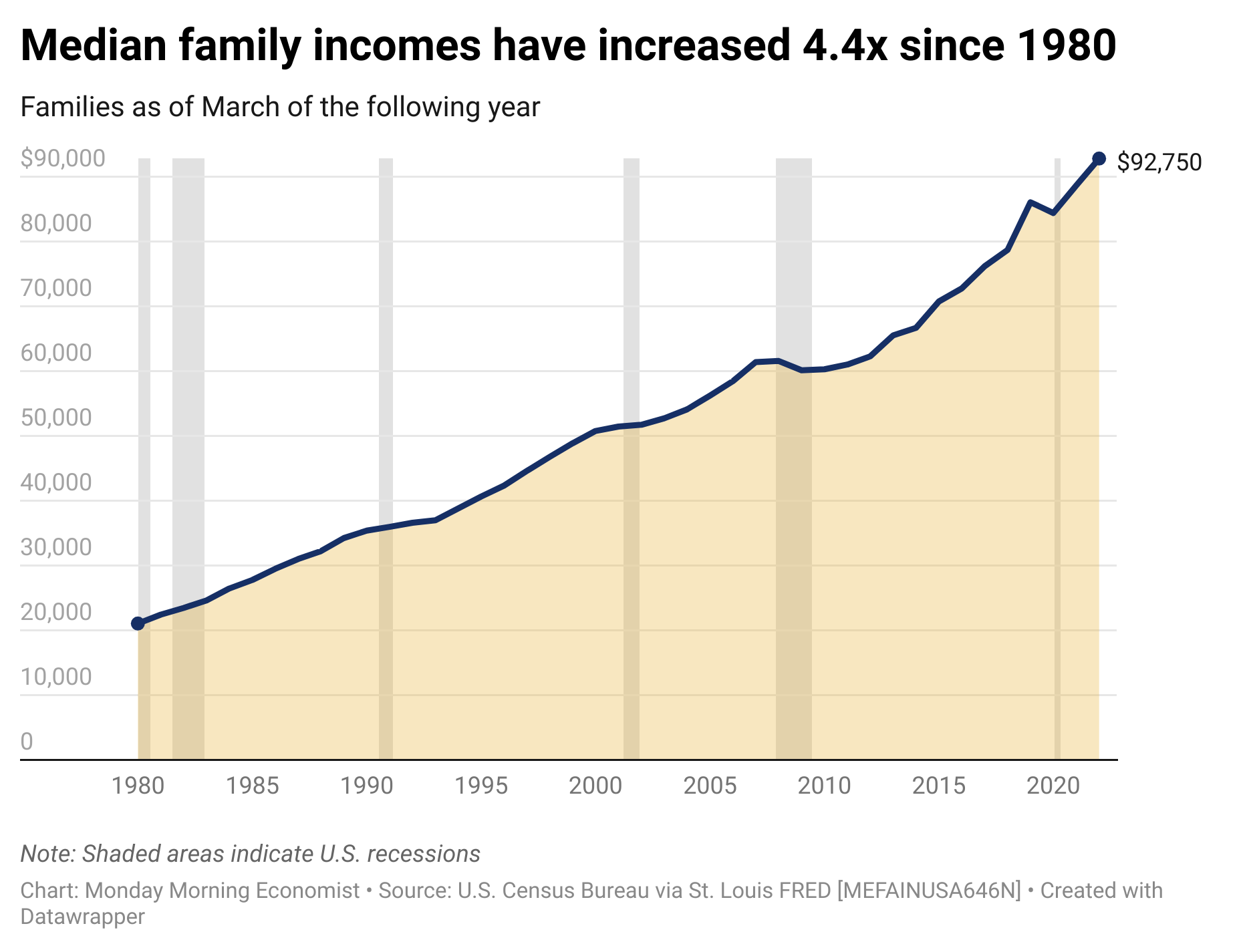 Even if we were to just look at changes in income based on inflation, American families are doing much better. Adjusting for inflation, $21,020 in 1980 is equivalent to roughly $74,648 in 2022. This means that, in real terms, median family income has increased significantly more than the general price level, rather than stagnating as Smith suggests.
