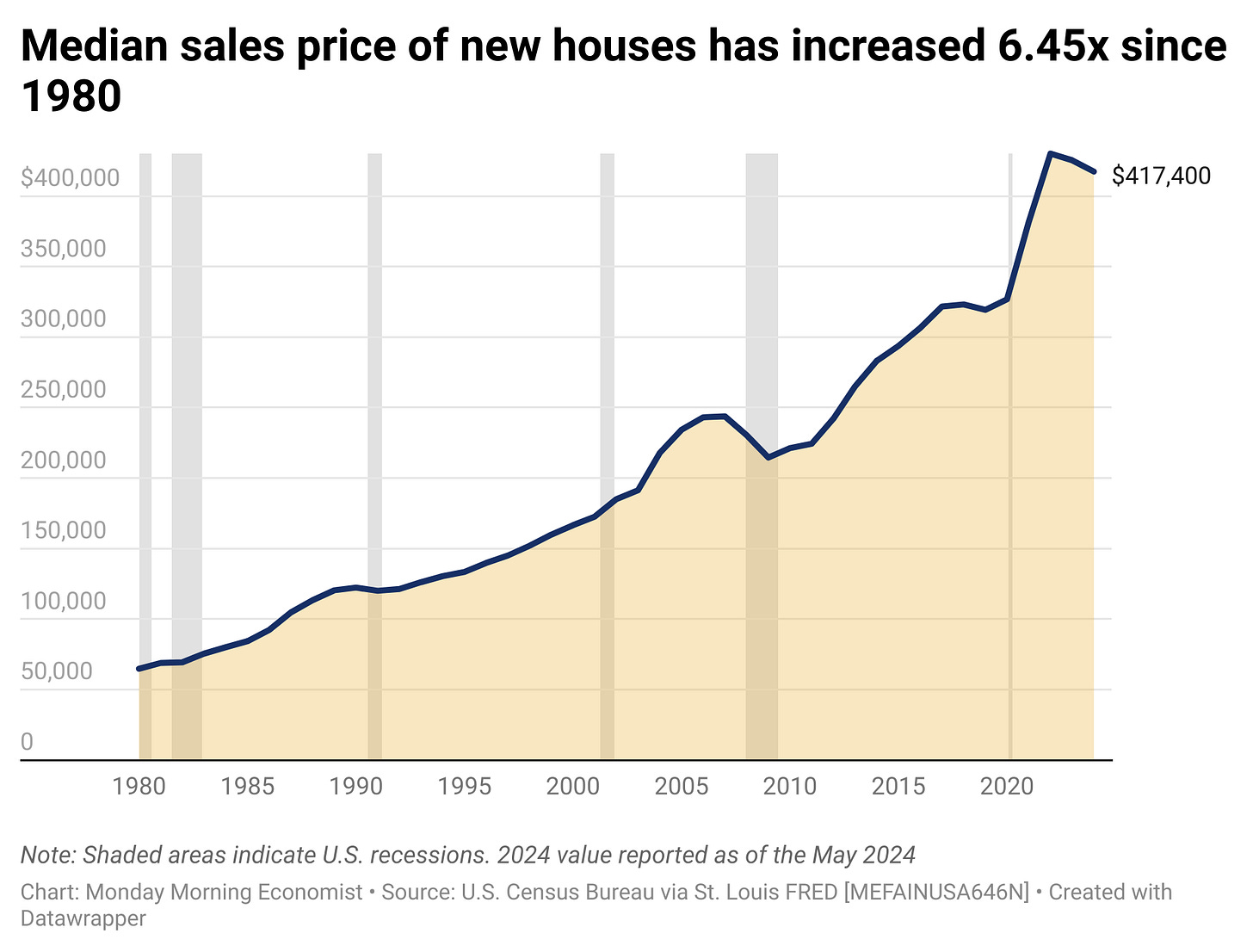 The Census also tracks the median asking sales price for vacant homes, which includes both new and old properties. In the first quarter of 2024, the median asking price for these vacant homes was $334,800. This paints a very different picture from Smith’s claim. The dynamics of the housing market—like supply and demand imbalances, zoning ordinances, lower interest rates, and increased construction costs—all play important roles in who prices have changed over the past few decades.