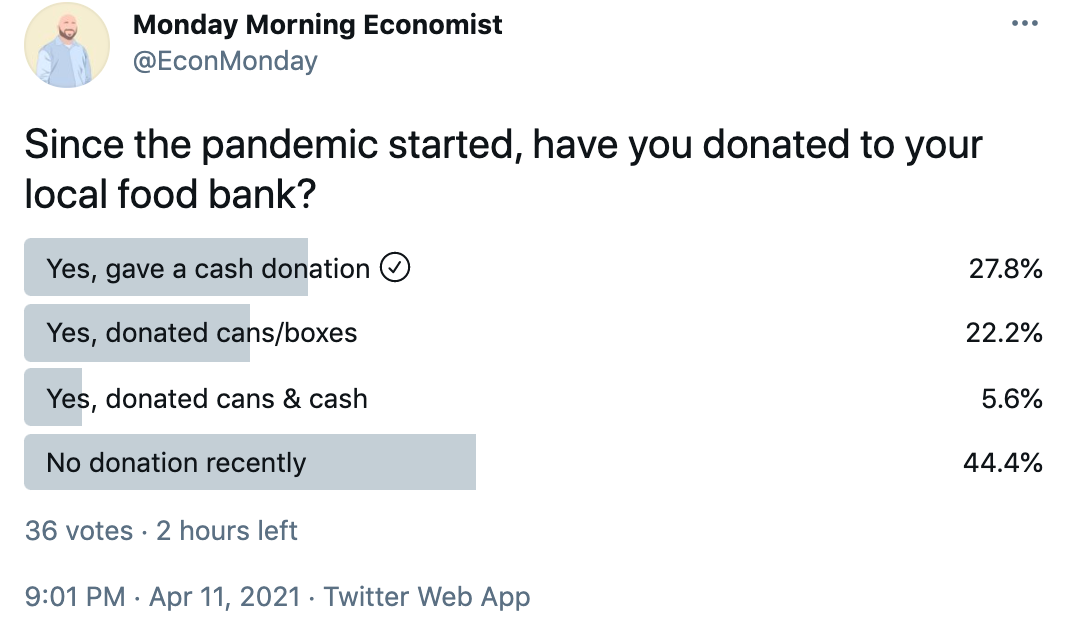 Some people don’t feel comfortable or aren’t able, to donate cash. Some donation is better than no donation at all. While cash may be the best way to donate, it’s not the only way to give. I ran a poll on my new Twitter account, and even in the middle of a pandemic, many people have found a way to donate to their local food banks: