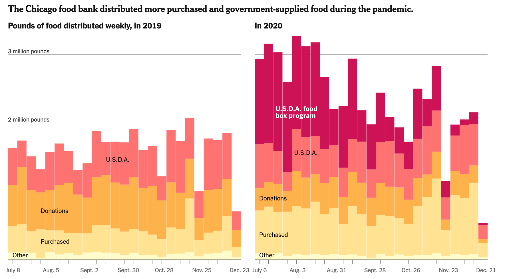 Food banks across the country served an estimated 50% more food in 2020 than they did the year before. Despite the increase in distributions over the past year, the Census estimates that roughly 8.8% of adults across the United States still report not having enough to eat over the last 7 days. Some of the largest metro areas in the US, like Houston (14.5%) and San Francisco (9.4%), are at even higher rates. Food insecurity during the pandemic was about 3 times higher compared to the year before, in spite of record distributions by food banks. Here’s a look at the Chicago food bank: