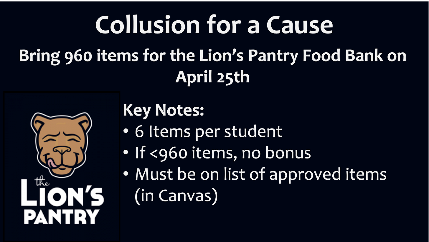 In past semesters of my principles class, I have used donations as a way of illustrating the difficulty of collusion. The last semester I did this, I had about 160 students in the class and I offered them a challenge I called “Collusion for a Cause.” Students could bring items to donate to the campus food bank on the last day of class if they wanted to. Donations were voluntary. If they collectively brought at least 960 items (6 items each) then I curved the entire class by 1%, even if they didn’t donate individually. If the class collected less than 960 items, the food pantry would still receive the donation, but my students wouldn’t receive a curve. Here’s the slide I showed 2 weeks before the last day of class:
