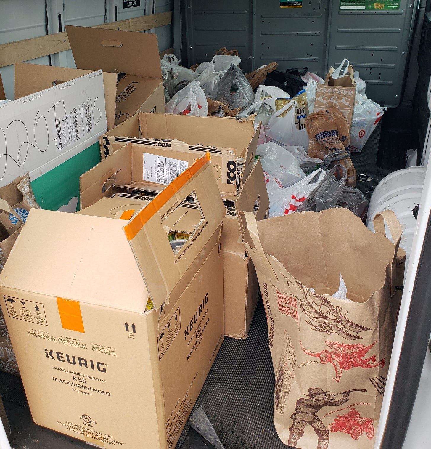 I had rented a UHaul van to transport the items from the classroom to the Food Pantry. I learned my lesson when I was at Washington State and tried this same challenge. My small car does not appreciate the weight of that much food. Here’s a look at the back of the UHaul: