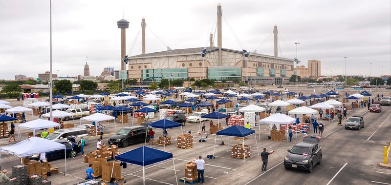 I didn’t notice it at the time, but the cast was raising money for Feeding America, a nationwide collective of food banks. I naively missed all the early stories on the pandemic’s impact and how food banks were already being stretched thin. Millions were in need of help, and many were visiting food banks for the very first time. Scenes like this one in San Antonio were common across large cities: