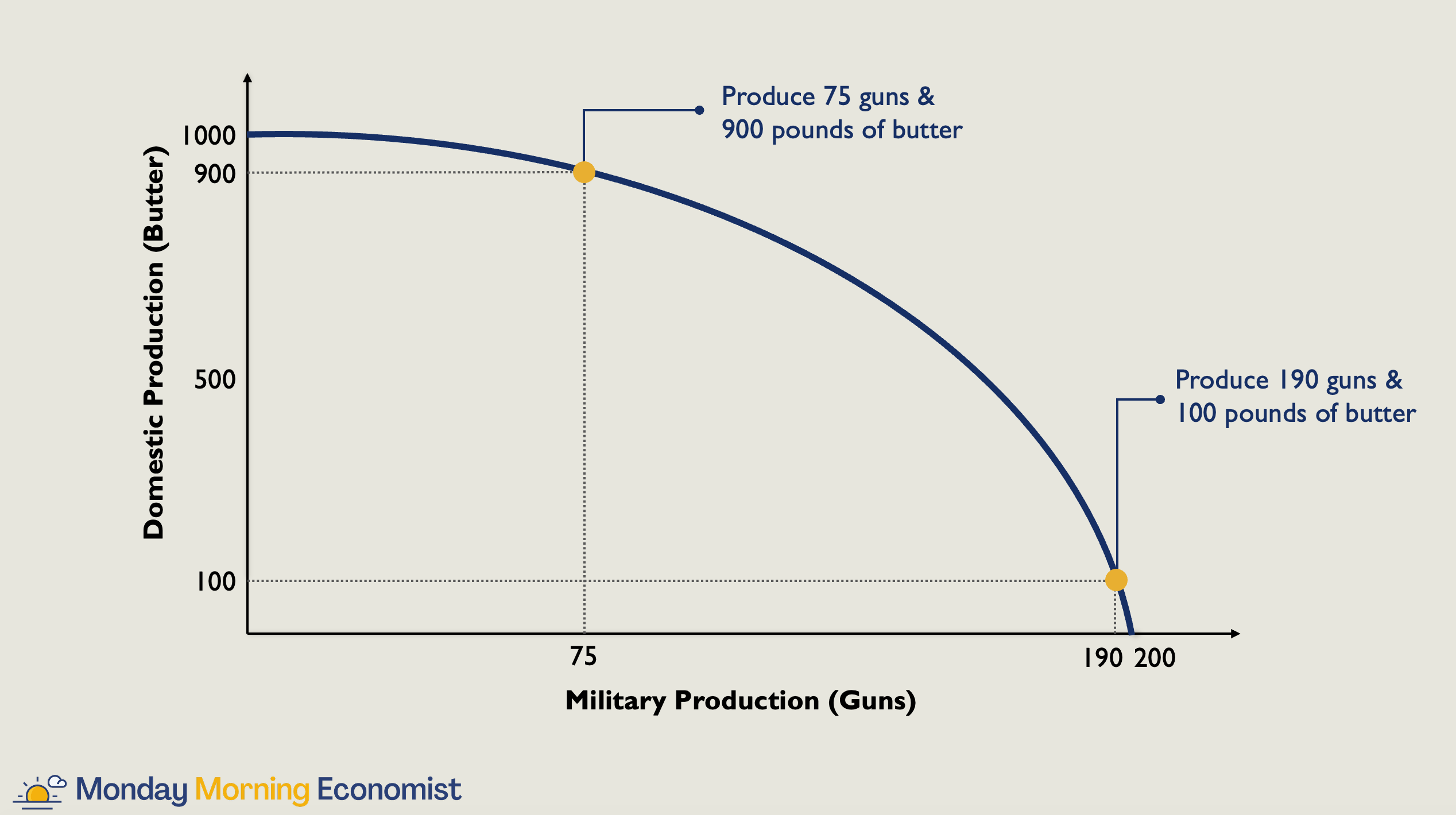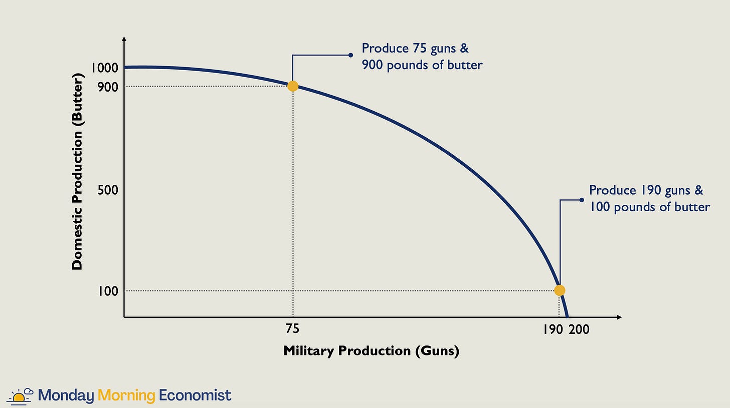 Now imagine you’re already spending massively on the military, and you want to spend even more. You’re pulling teachers out of classrooms, diverting steel from apartment buildings, and taking resources that were really good at making butter and forcing them to make guns. Each additional dollar costs you more and more civilian welfare. Economists call this increasing opportunity costs, and it’s why the trade-off gets more painful the further you push a country toward the endpoints.