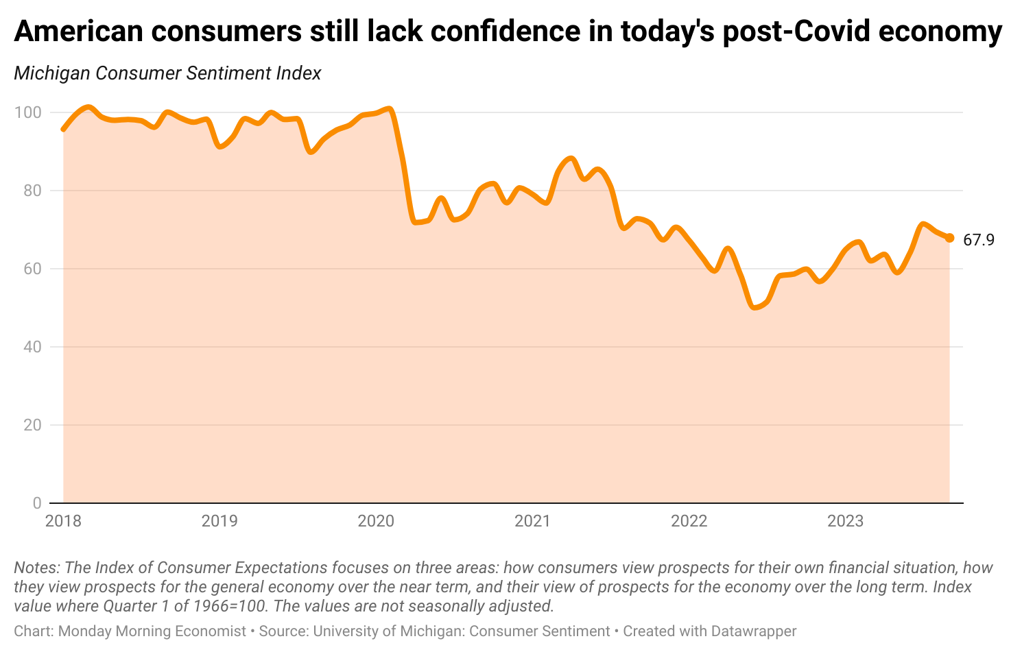 But again, why are people suddenly splurging on Halloween costumes and decorations when those same people have such a gloomy outlook on the economy? The COVID-19 pandemic left a deep mark on our economy and our confidence in it. Lockdowns, job losses, and uncertainty made people more cautious about their spending. Fast forward, and inflation remains a persistent challenge, while investors grapple with the uncertainty of whether the Federal Reserve will raise interest rates again. For many consumers, the past few years have felt like navigating a haunted house filled with economic uncertainties.