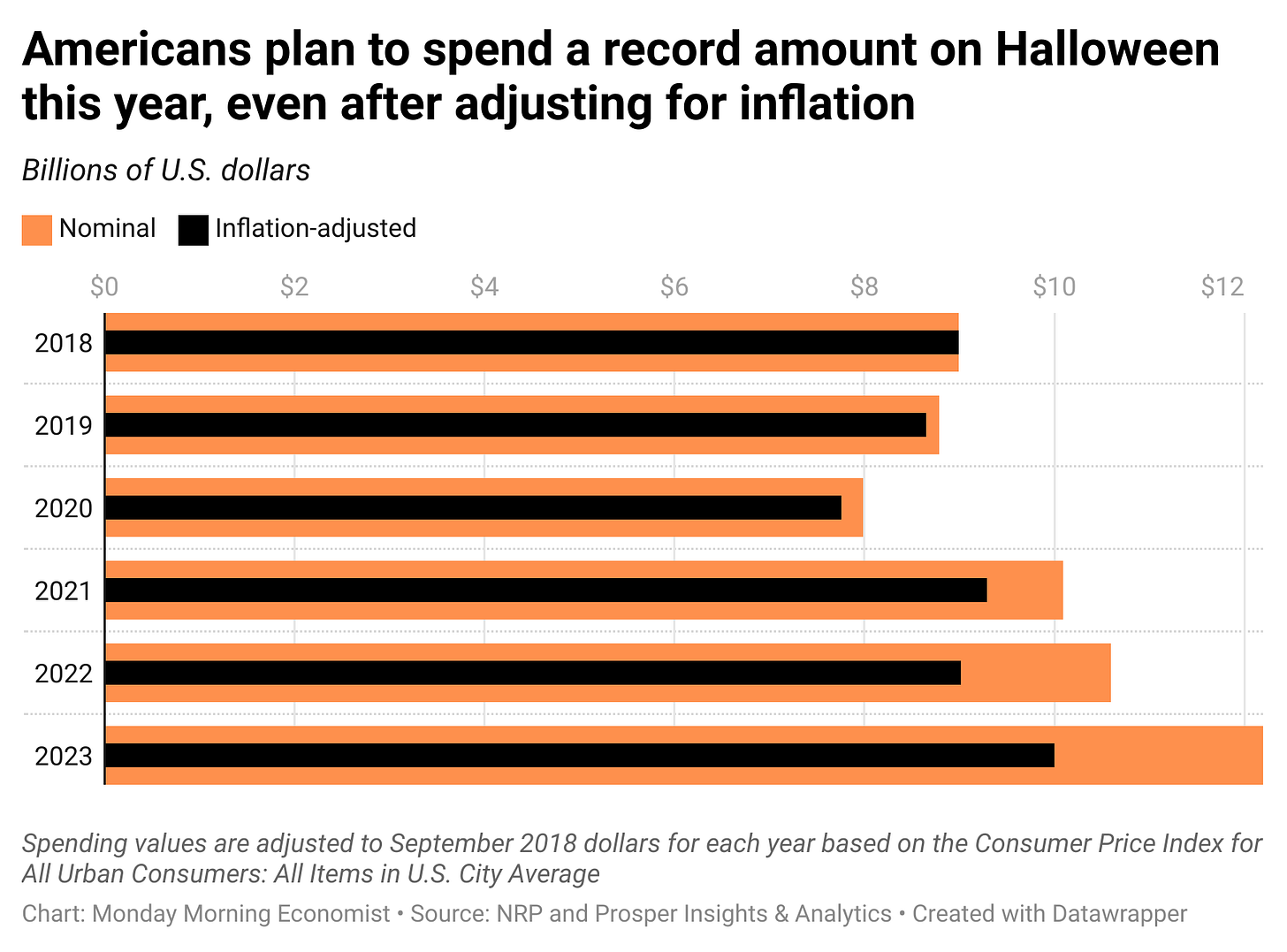 In the spirit of trick-or-treating, I’ve arranged this week’s newsletter to mirror a trip around your local neighborhood. Instead of collecting miniature candy bars, you’ll be collecting fun-sized examples of economic concepts you may see during Halloween. As a preview of what to expect, we’ll look at economic concepts that are behind: