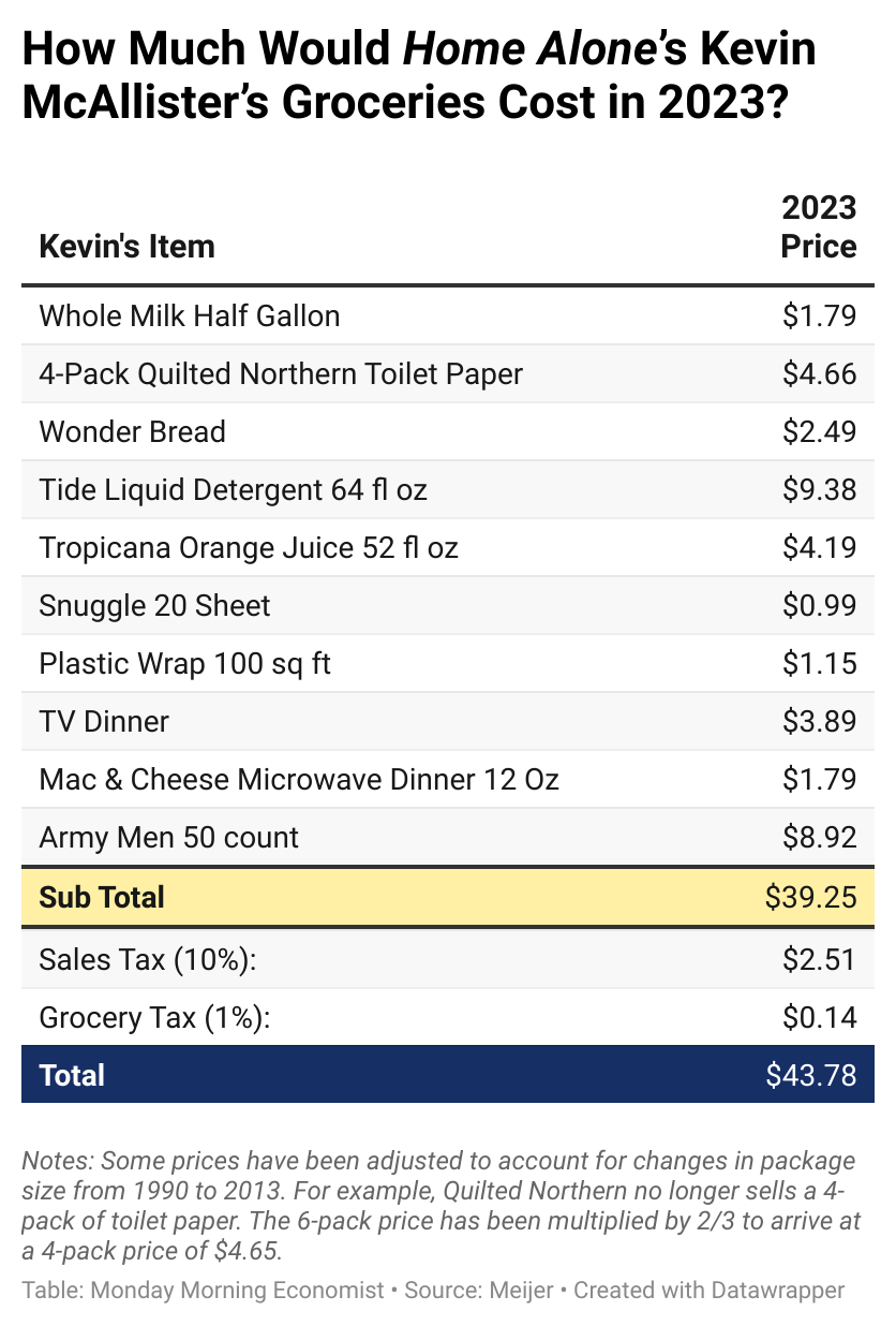 The 1990 holiday classic “Home Alone” is more than mere slapstick and booby traps, it’s a film about, well, the economy. Now grown up, once childhood viewers begin questioning the size of the mortgage, the bill for the large family international flight, and just how much Kevin’s grocery store visit of $19.89 would cost today accounting for inflation. Let’s explore thirty years of price changes while listening to John William’s Oscar-nominated score in the background.