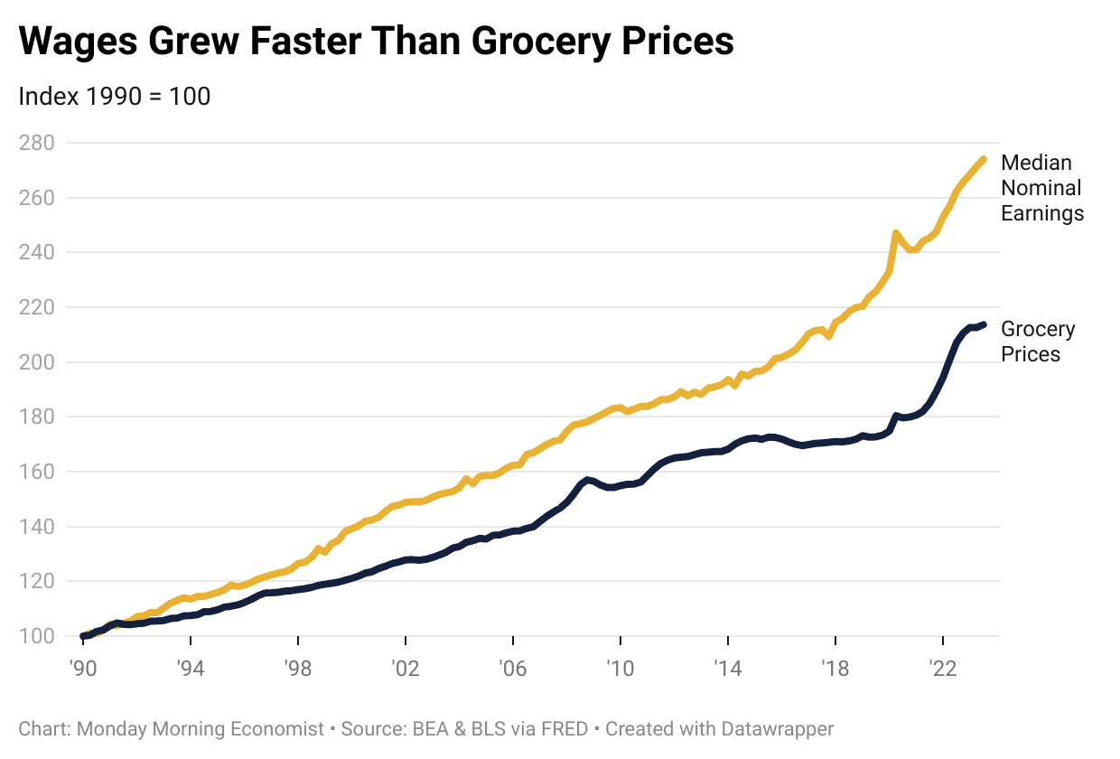 Our final receipt from Meijer reveals something intriguing. A careful look at Kevin’s equivalent shopping cart shows prices have increased 121% since 1990! Thanks to BLS, we can look at official measures of food prices from the period. Since 1990, grocery prices have grown 114%. That’s quite a jump, but here’s the catch: this change is still much slower than the average price change (129%) since that period and, far more importantly, is also much slower than wage growth. In fact, median wages have surged by a remarkable 174% over the past three decades!