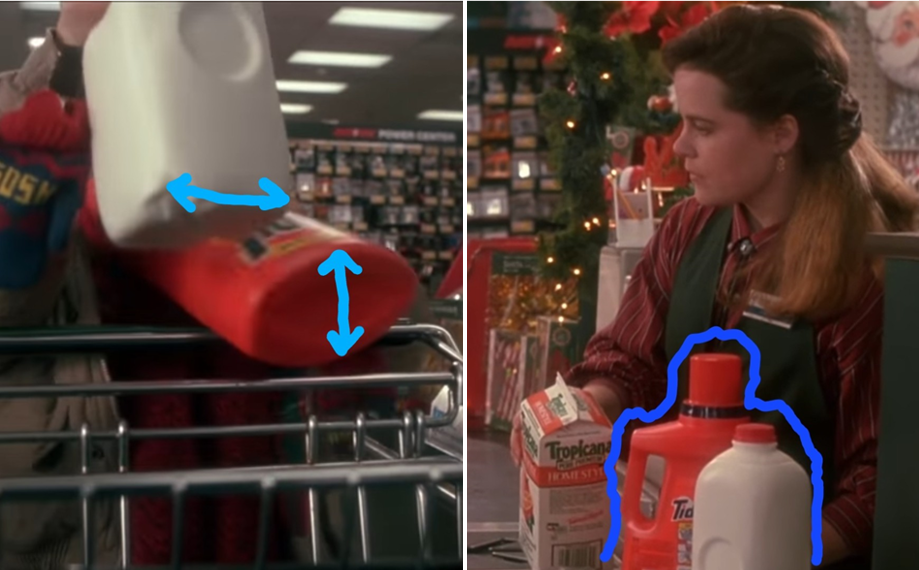 Tide currently sells bottles that are either 92 or 37 fluid ounces oz, but which one did Kevin purchase in the scene? The current product dimensions note that the base for the 37 oz is 6"x3" and is 9" tall. For comparison, the half-gallon of milk is also 3" wide and around 9" tall. The bases of these two items match in this first screenshot.