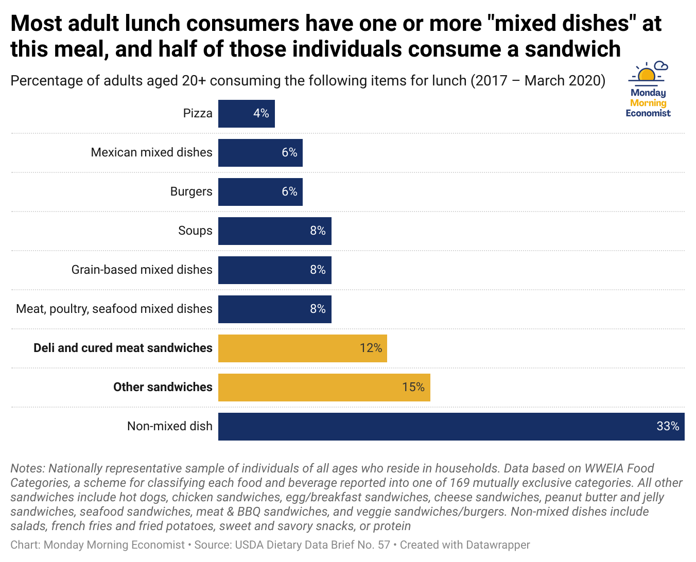 Two-thirds of adult lunch consumers have one or more “mixed dishes” at this meal on the intake day, and half of those individuals consume a sandwich [USDA Dietary Data Brief No. 57]