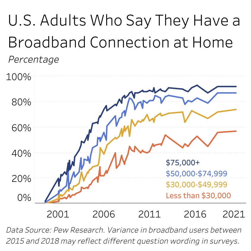 About 77% of U.S. adults say they have a broadband connection at home [Pew Research Center]
