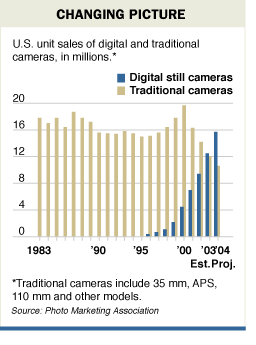 Kodak would eventually develop and patent the first handheld digital camera in 1975, but it wasn’t until the mid-1990s that digital camera sales really took off. As sales grew, traditional film sales slowly declined. While Kodak had a strong presence in the film and camera sector, there were many more competitors for digital cameras. A January 2004 Wall Street Journal article announced that Kodak would stop reloadable film-based consumer cameras in the U.S., Canada, and Europe by year's end. Here’s an early infographic from that article highlighting traditional camera sales (in beige) and digital camera sales (in blue):