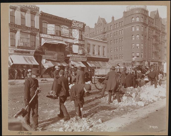 The emergency snow shoveling program was initially offered as temporary employment for men left economically devastated by the panics of 1857 and 1893 [Slate]