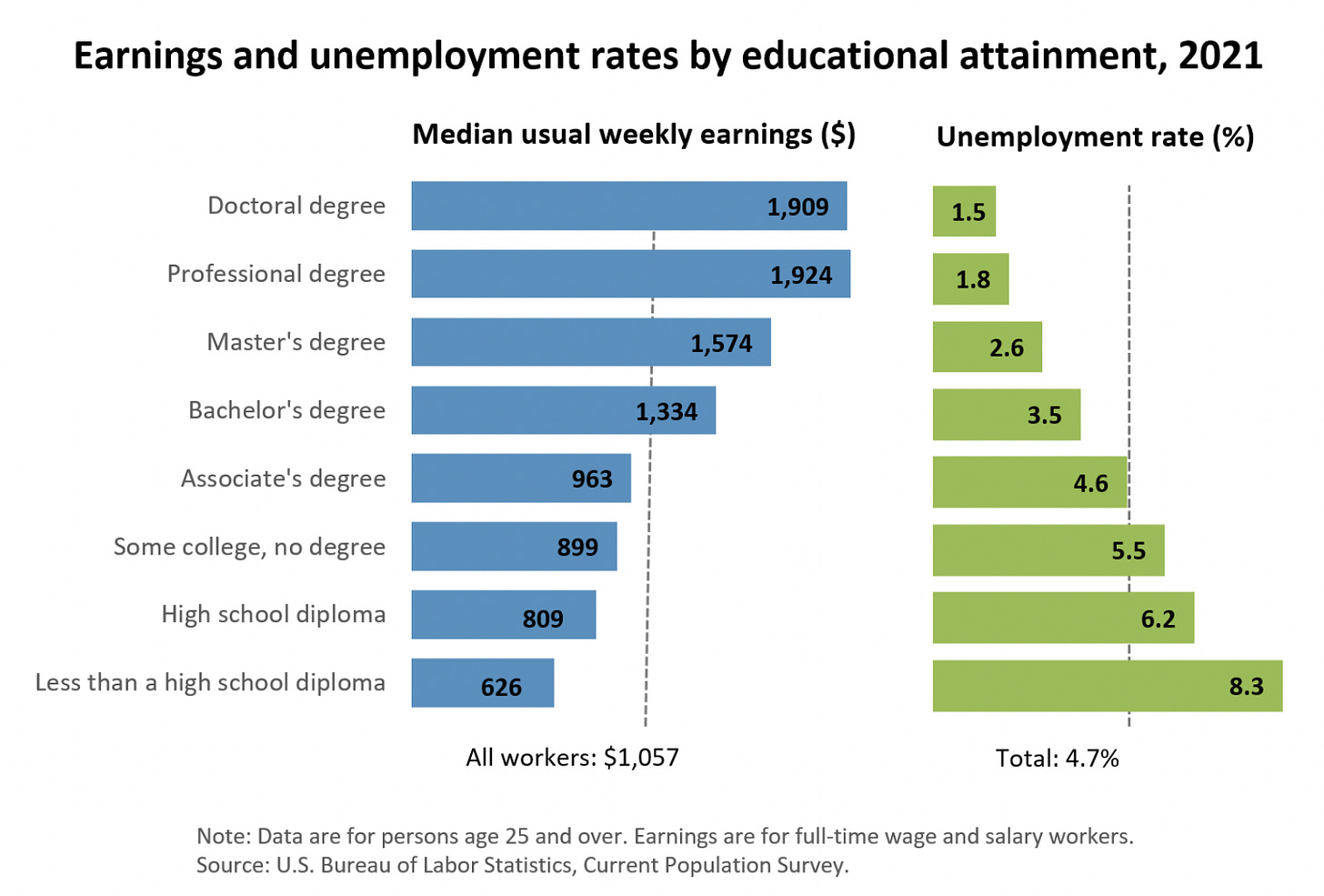 There are a number of benefits associated with obtaining additional education beyond a high school degree, including lower unemployment rates and higher earnings. In order to obtain those benefits, however, there are some serious upfront costs. The most obvious costs, tuition and fees, can be relatively small compared to the opportunity cost of spending additional time in school instead of working full-time. Recognizing opportunity costs can be challenging for a lot of people.