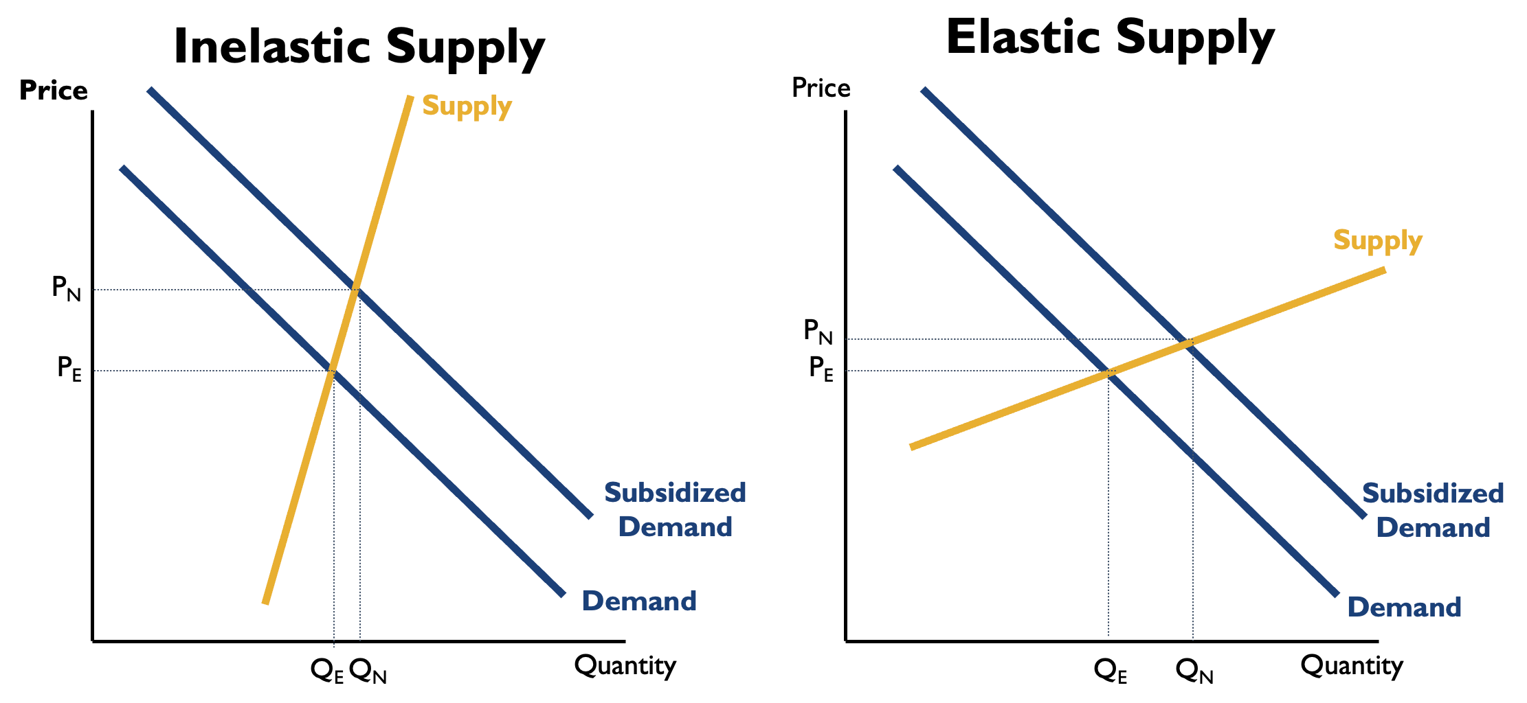 This distribution is determined by the relative elasticities between buyers and sellers. Depending on how responsive buyers and sellers are to price changes will determine which side of the exchange will receive the larger share of the subsidy. These subsidies are intended to increase the demand for electric vehicles, which increases the final sales price of the product. The size of that initial price increase, however, will be based on relative elasticities. While the exchange price between buyers and sellers will be higher than before the subsidy, buyers will pay less overall once the tax credit has been applied. Elasticities can help us understand how much less buyers pay compared to how much more sellers receive.