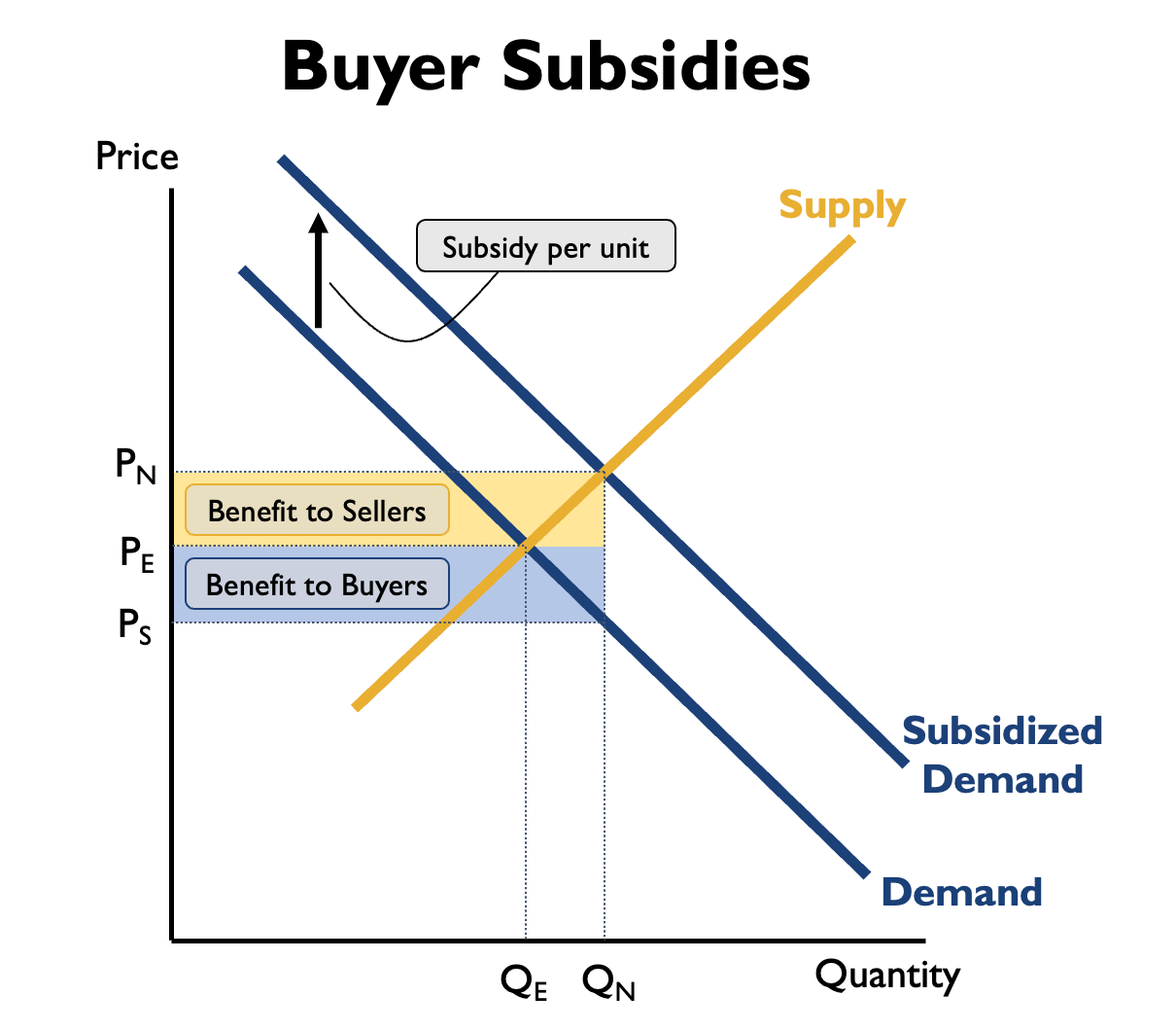 It is important to note that the impact of a subsidy on buyers and sellers is not always this straightforward. In some cases, the subsidy may have a larger impact on one group over the other, depending on the specific market conditions or the elasticity of different groups of consumers. While subsidies can be beneficial in encouraging certain behaviors, it’s important to recognize that those benefits incentives don’t flow entirely to the intended recipient.
