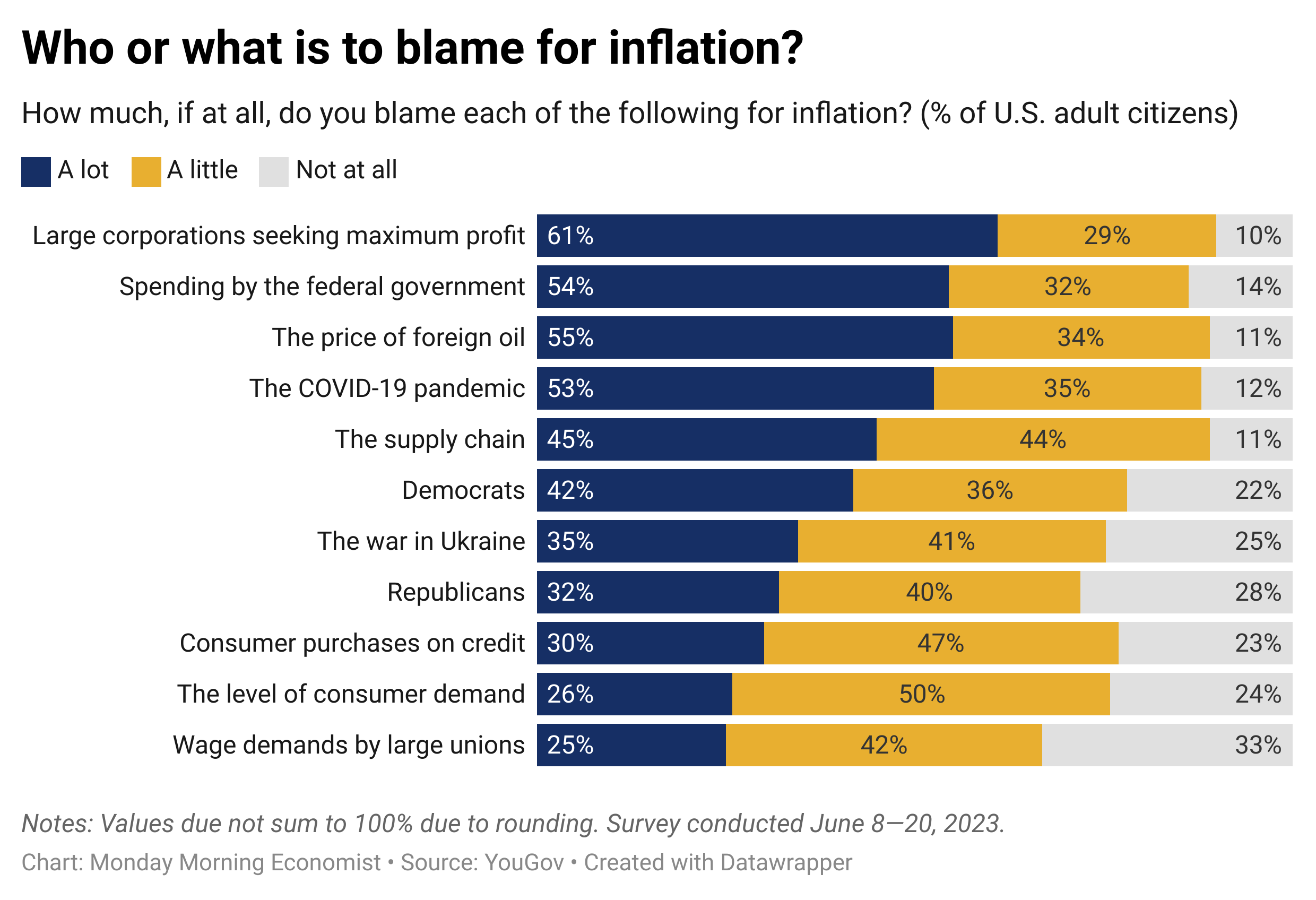 Between October 2022 and June 2023, the share of Americans who say that "large corporations seeking maximum profits" deserve "a lot" of blame for inflation rose 9 percentage points, from 52% to 61% [YouGov]