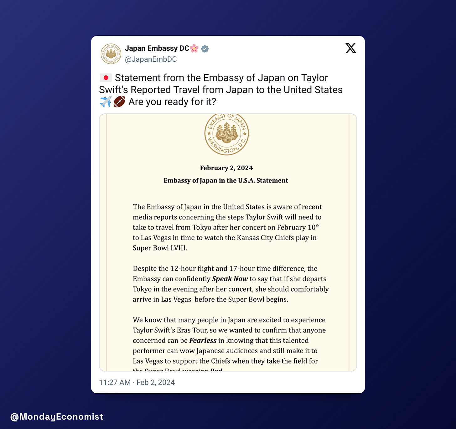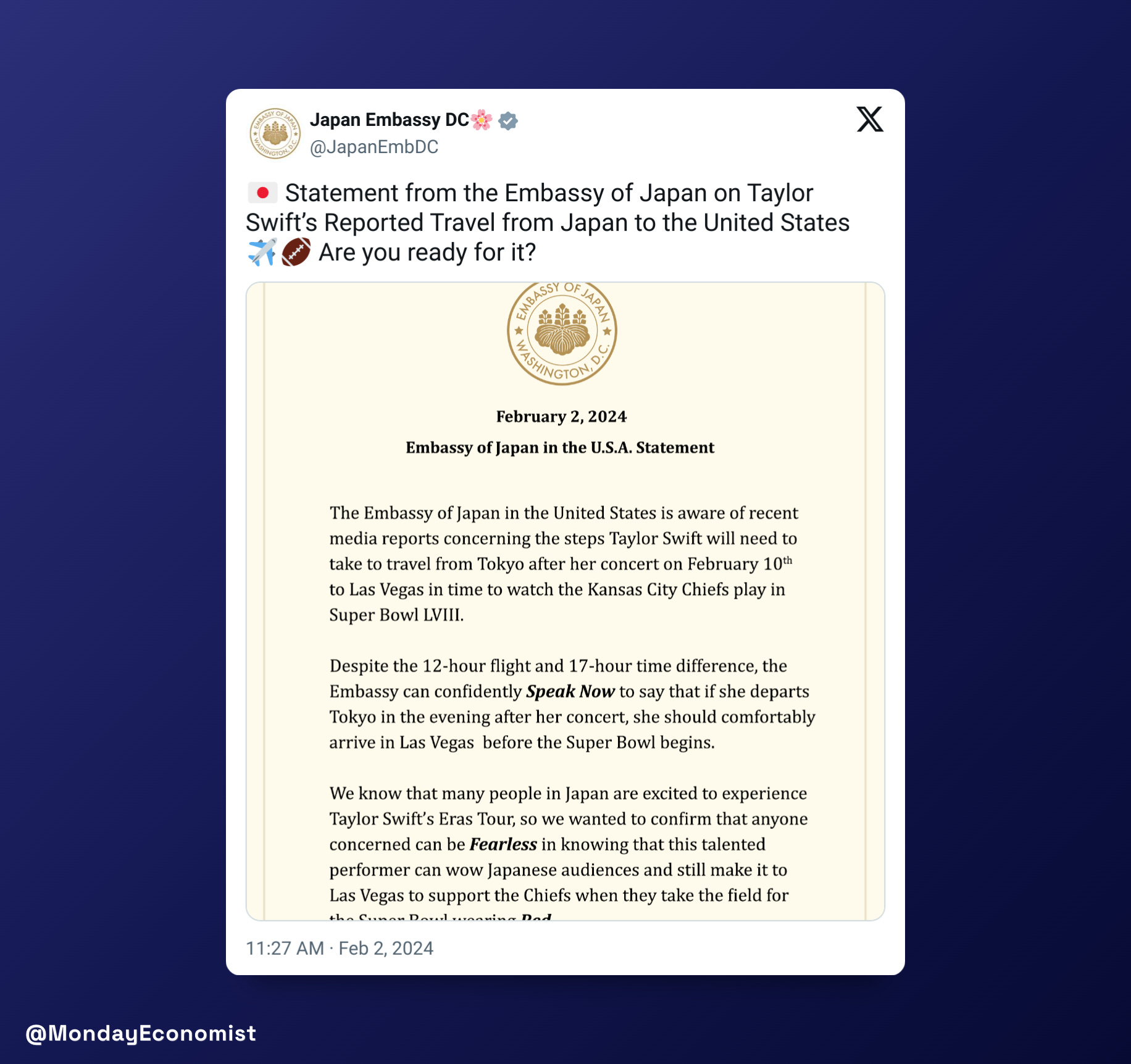 Yet, whispers of Swift’s global dash from a concert in Japan to make the game in time have fueled a frenzy, including a tweet from the Japanese embassy and a flurry of prop bets for would-be gamblers. The Super Bowl has always been the biggest television event in the United States, but her presence has transformed Super Bowl Sunday into a global spectacle where sports and pop culture collide head-on.