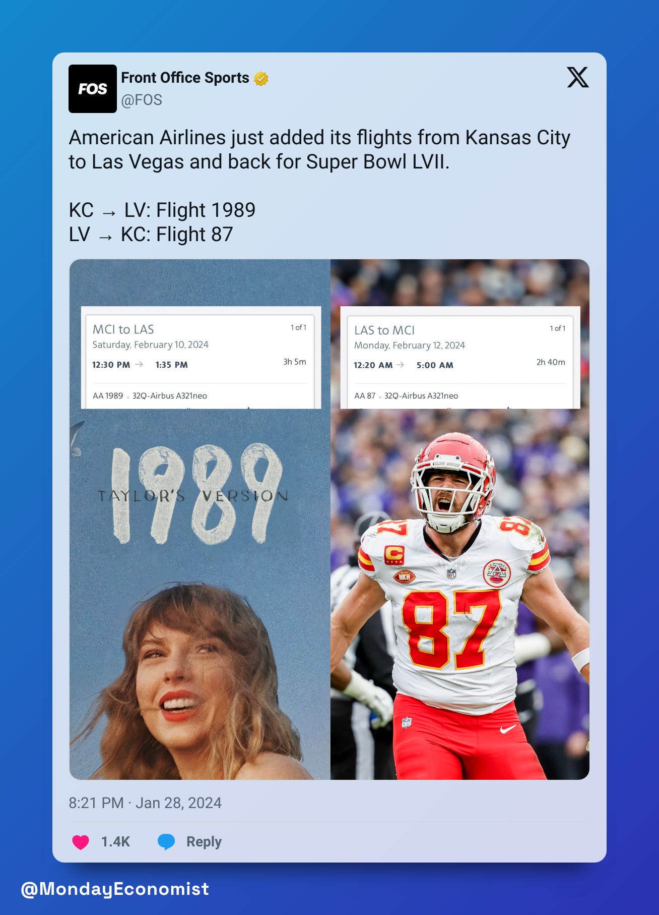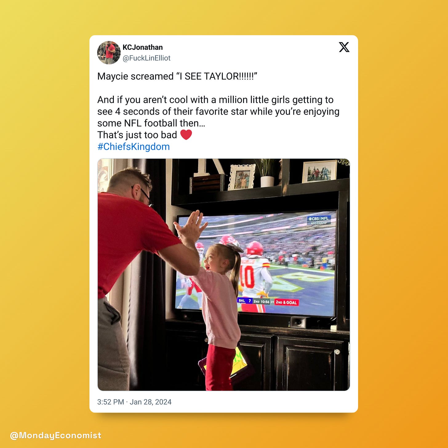 Perhaps we can end by highlighting a narrative that truly embodies the unexpected fusion of pop culture and sports at the extensive margin. While it’s easy to talk about the economic and business implications of the NFL’s handling of Taylor Swift, there is a simpler, yet impactful story that a lot of people missed last Fall: the bonding moments between parents and their children over football games, sparked by Taylor Swift’s arrival.