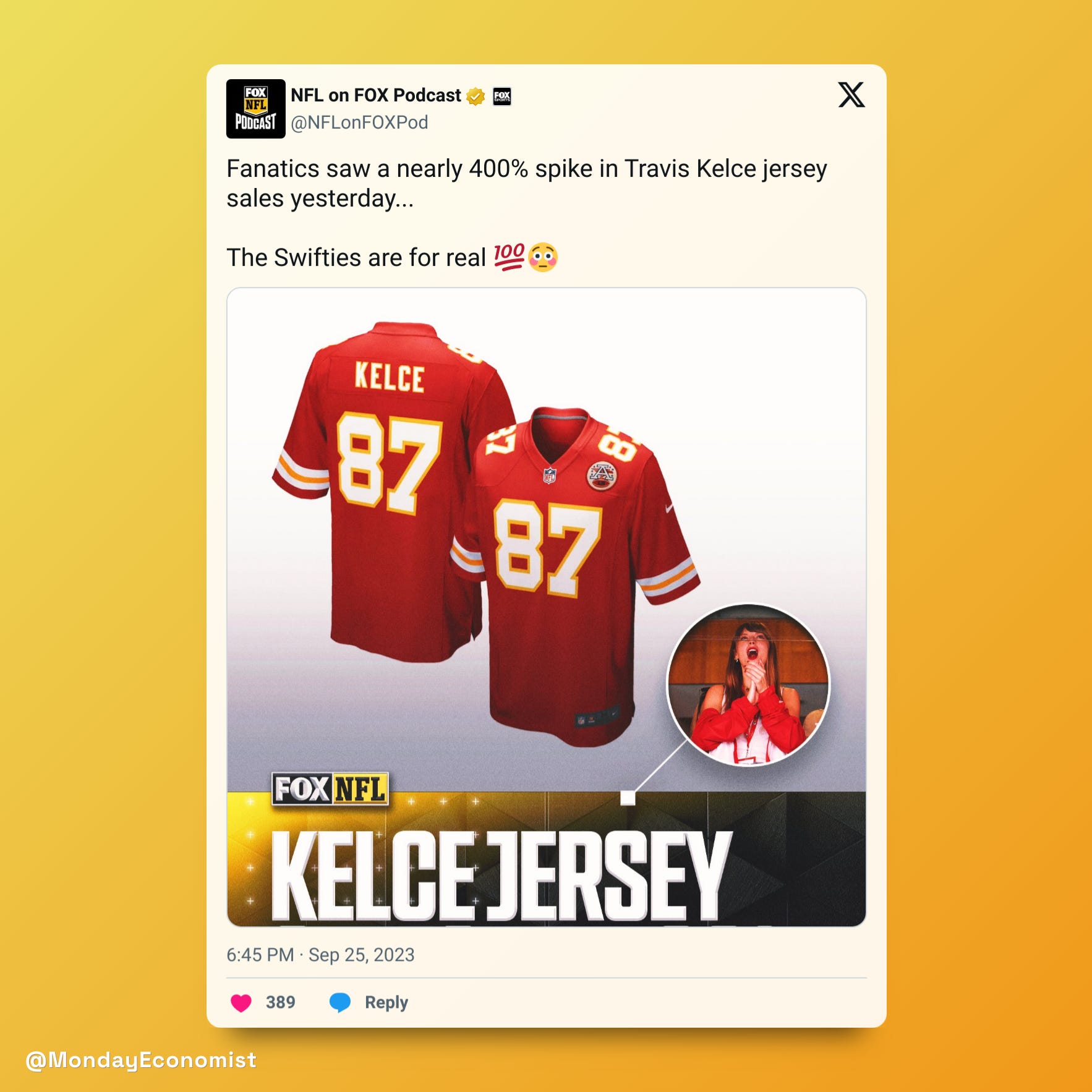But the Swift effect doesn’t stop at merchandise. The social media world has experienced that growth, too. Travis Kelce’s Instagram followers jumped by 80%, topping the charts at over 4.5 million within just a few weeks of her first game. And what about Travis’s team, the Kansas City Chiefs? They welcomed 500,000 new followers into their social media fold within a few weeks of Swift’s first game. The NFL took advantage of their new fans and posted about Swift 34 times across social channels in the week after she showed up, nabbing a massive 170 million impressions.