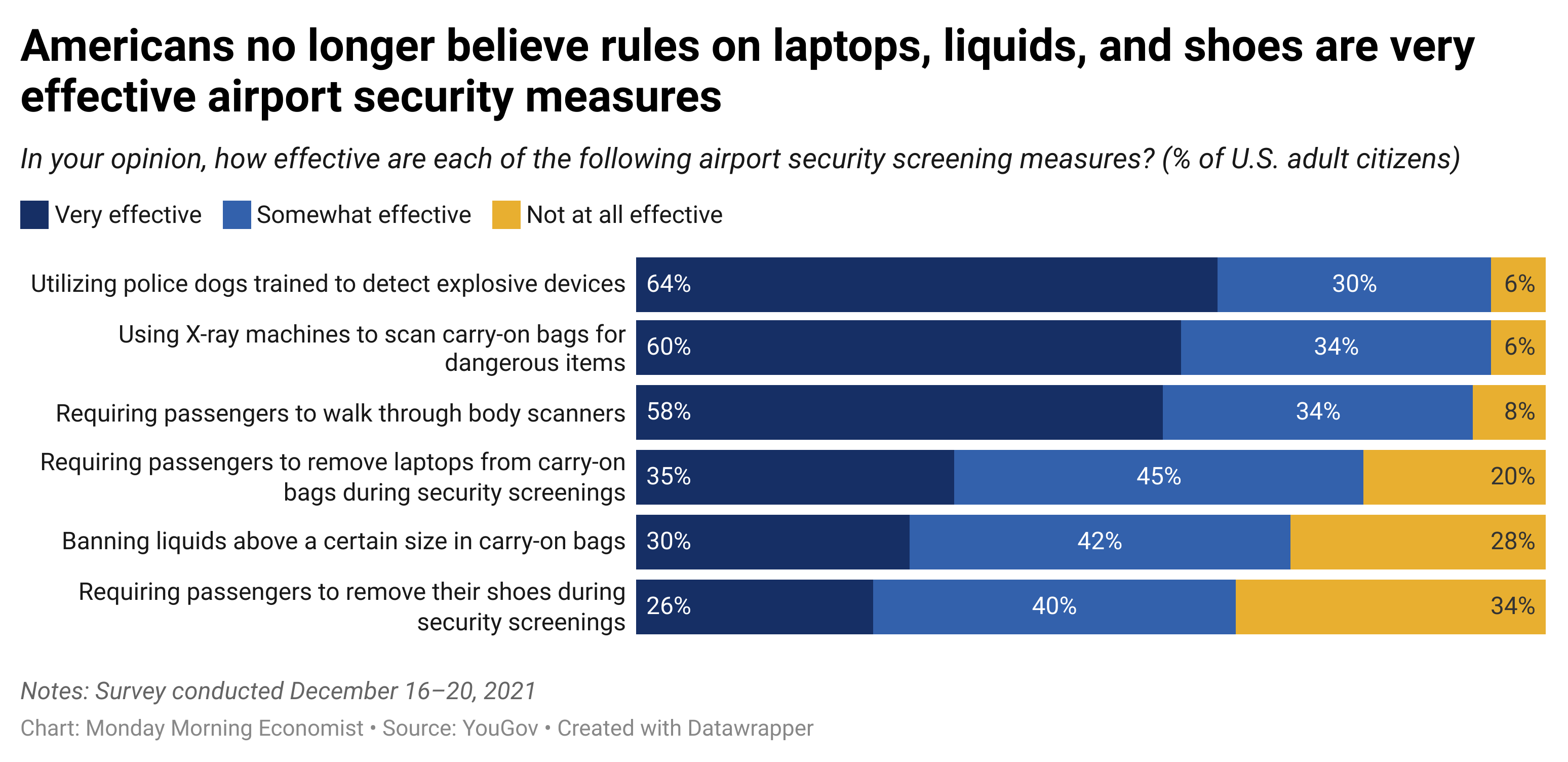 The chart, "Americans no longer believe rules on laptops, liquids, and shoes are very effective airport security measures" points to an interesting dichotomy. During the pandemic, ~50% of Americans believed masks were ineffective. 50% of Americans believed immunizations were ineffective (20% believed they contained Bill Gates' microchips*).