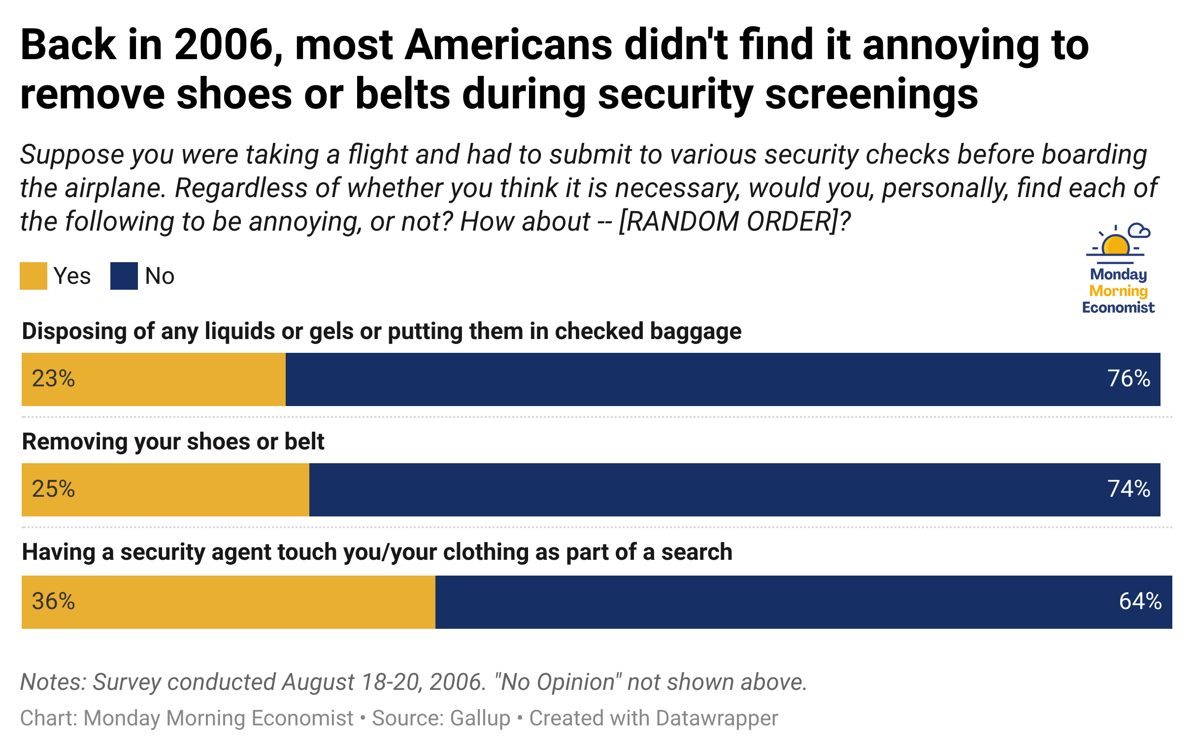 It’s easy to dismiss something as “just a few seconds.” But a good economist will remind you that when you multiply small costs by millions of people, they’re not small anymore. It’s probably not too surprising that Americans were starting to question how effective the policy truly was.