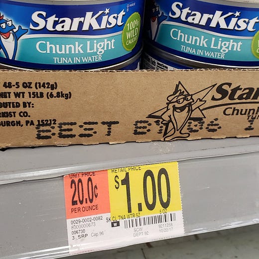 A couple of years ago, three major tuna brands admitted to conspiring to fix tuna prices in the United States. The three companies controlled about 80% of the US market for canned tuna, but Walmart noticed that their prices seemed to be off. If you’re purchasing tuna in large quantities (the bigger cans), you likely pay a premium for the larger cans. I snagged these photos on a trip to Walmart a couple of years ago: