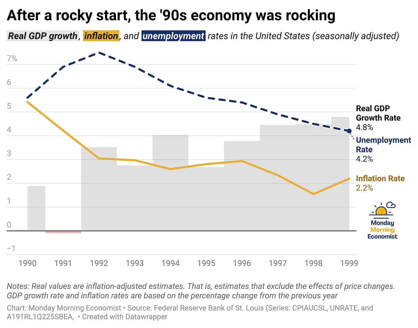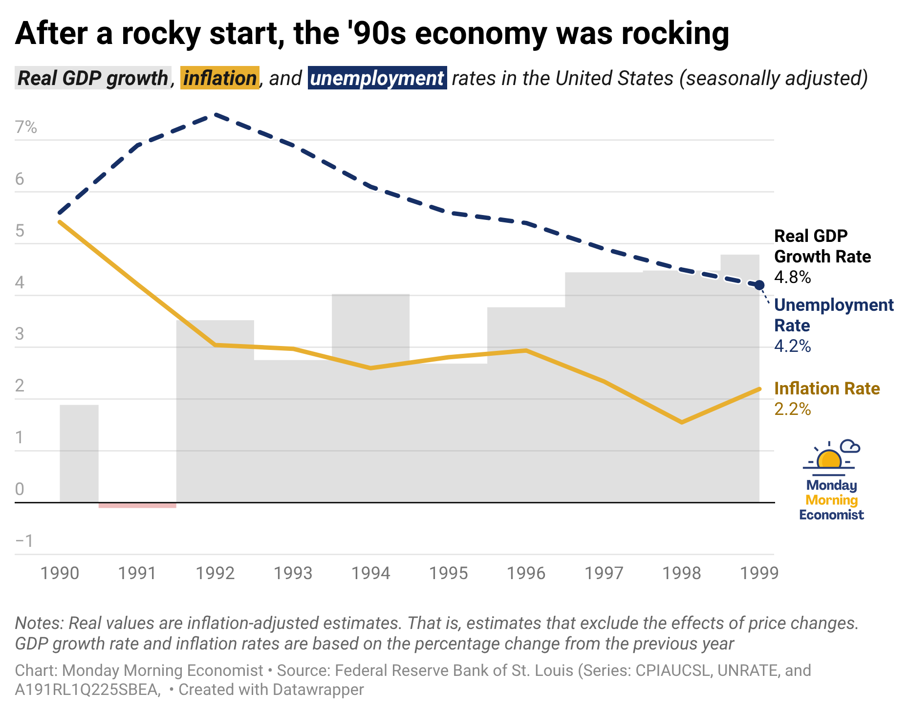 I grew up in the ’90s, so naturally I wanted to reminisce too. But I’m an economist. So instead of posting throwback photos, I’ve been thinking about a different kind of throwback: what was the economy like in the ’90s?