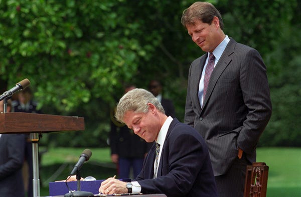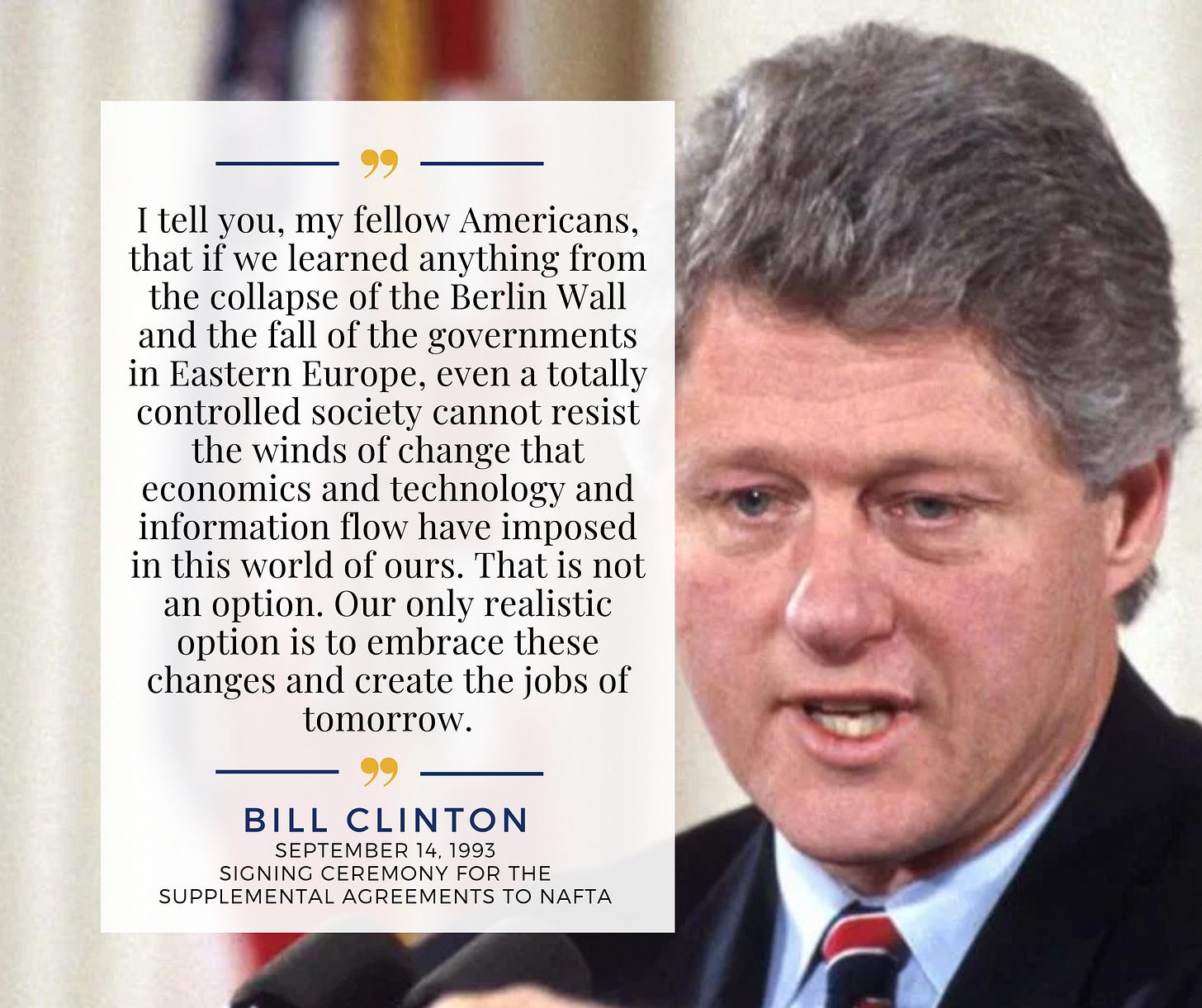 Now let’s talk about two of the biggest events that reshaped the U.S. economy in the 1990s. The first was NAFTA, first popularized by Ronald Reagan and then negotiated by George H.W. Bush. Clinton signed it into law in December 1993, effectively eliminating most tariffs between the United States, Canada, and Mexico. Significant? Yes. Controversial? Also yes.